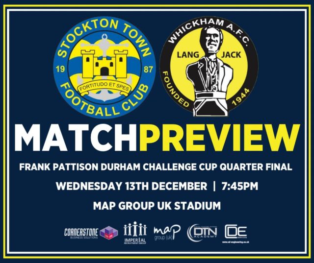 |STOCKTON TOWN VS WHICKHAM FC COMPETITION: ‘Frank Pattison’ Durham Challenge Cup – Quarter-Final DATE: Wednesday 13th December, 2023 KICK-OFF: 19:45 ENTRY: £5 Adult, £3 Concession,