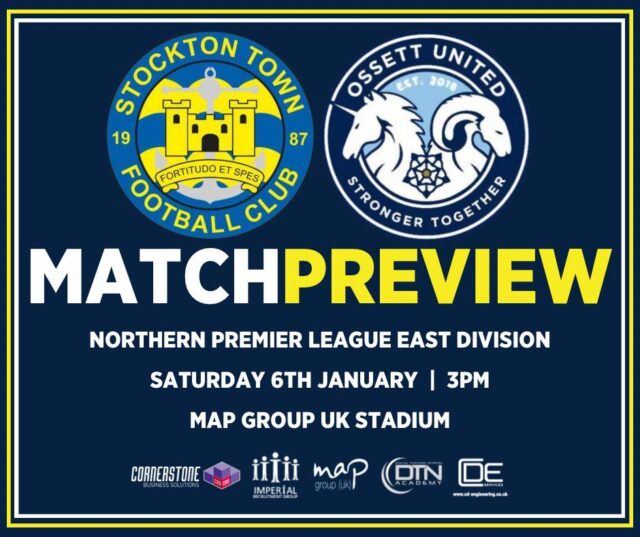 STOCKTON TOWN VS OSSETT UNITED COMPETITION: Northern Premier League East Division – Matchday 20 DATE: Saturday 6th January, 2024 KICK-OFF: 15:00pm ENTRY: £9 Adult, £7