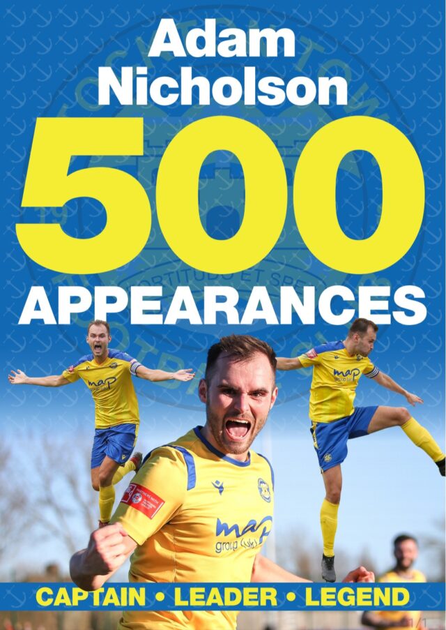 Captain Adam Nicholson marks a significant milestone during this Saturday’s game against Pontefract Collieries as he clocks up his 500th appearance. Following Tuesday’s postponement at