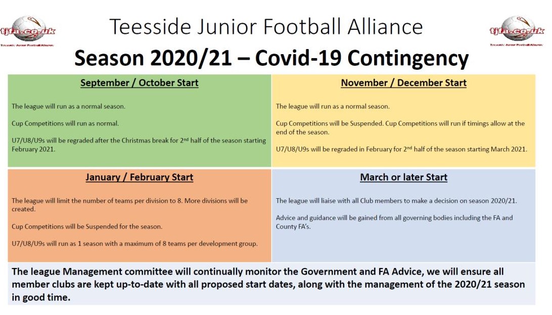 JUNIOR PLAYERS & TEAMS – the Football Club has registered all of our teams for the new season and we have received the following information from the TJFA indicating the possible scenarios for the commencement of next season.