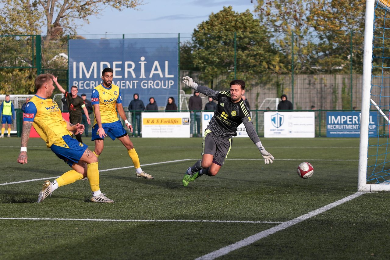 The opening half was competitive, with the visitors testing Stockton’s skills and looked lively. Stockton ‘keeper Nathan Harker was called into action early, producing a strong, diving save to deny the visitors’ first chance.